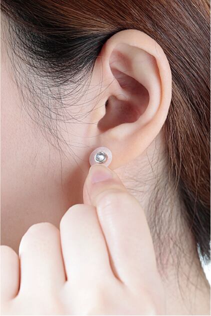 2.透明シートの横の点線を剥がしてパッチを取り、両耳に装着してください。